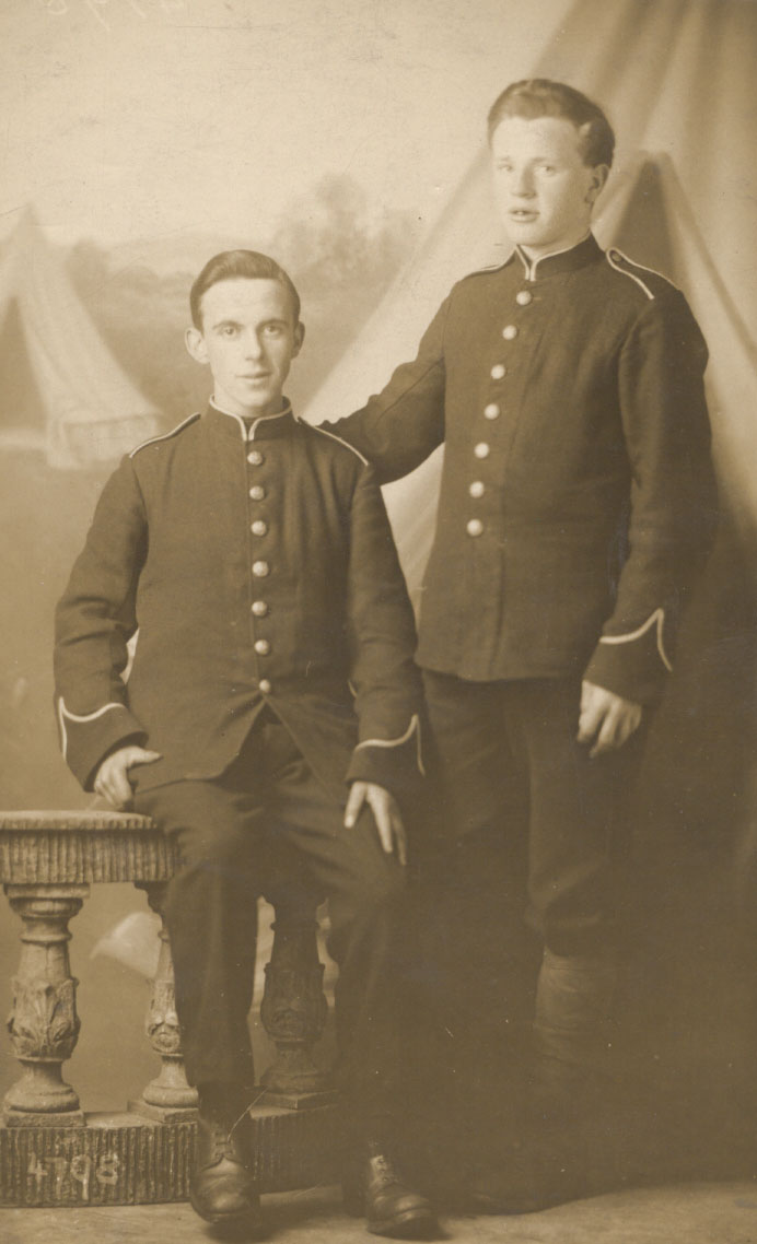 In the left photograph, William and Alexander are wearing ill-fitting scarlet jackets; uniform that was largely out of fashion by the time of the First World War. This suggests the image dates to late 1914 or early 1915, when the rapidly expanding army was faced with severe shortages of uniform and equipment resulting in new recruits being issued with old, obsolete uniform from stores. Both men are bare-headed, suggesting that there was no headdress available. The photographer’s negative number, 4798, is recorded in the bottom left corner of the photograph.